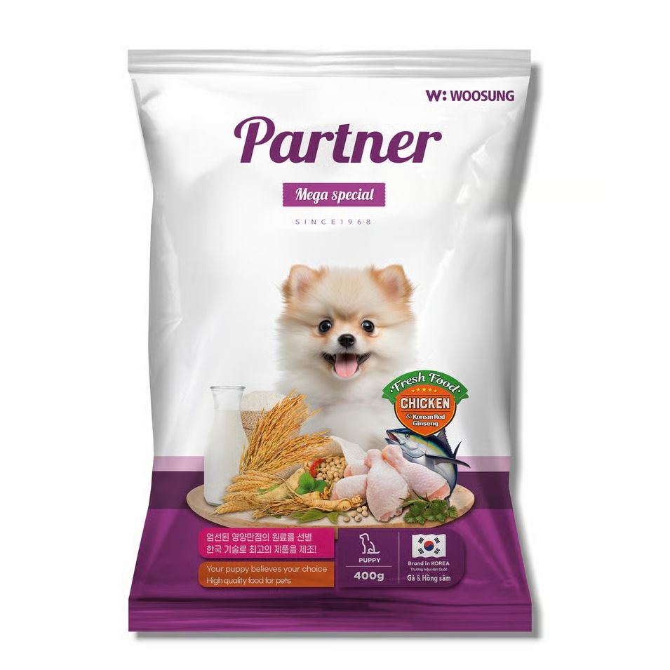 Woosung Partner Mega Special – Vị gà & hồng sâm là sự lựa chọn lý tưởng cho những người nuôi chó con muốn mang đến nguồn dinh dưỡng toàn diện.